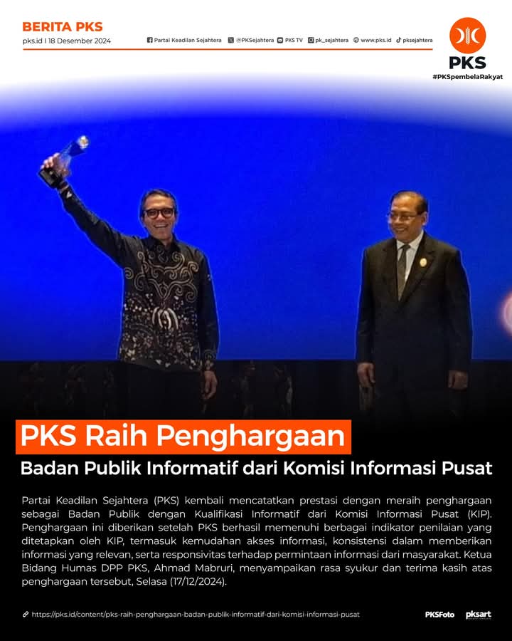 “Alhamdulillah, penghargaan ini menjadi bukti komitmen PKS dalam menerapkan prinsip keterbukaan informasi kepada publik. Kami percaya bahwa transparansi adalah kunci untuk membangun kepercayaan masyarakat terhadap partai politik,”